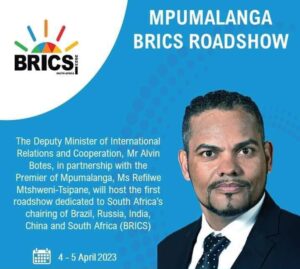 The Deputy Minister of International Relations and Cooperation, Mr Alvin Botes, in partnership with the Premier of Mpumalanga, Ms Refilwe Mtshweni-Tsipane, will host the first roadshow dedicated to South Africa’s chairing of Brazil, Russia, India, China and South Africa (BRICS) on Tuesday, 4 April 2023.