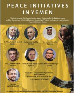 The International Christian University, Japan, the Center for Mediation in Africa, and the Department of Political Sciences, University of Pretoria organised a workshop on the Peace initiative in Yemen to address challenges and possible opportunities for peace building in Yemen on 8 November 2021